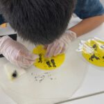 黄色の丸いペーパーに、絵の具をしみ込ませたスポンジを好みの月うさぎさんの型をポンポンポン!