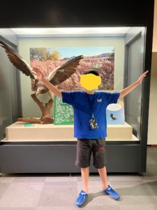 大きな鷲の剥製の前で剥製ポーズ!笑