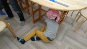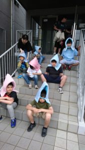 揺れが治まったらスタッフの合図で玄関まで避難。しっかりと点呼を座って待てるみんなの立派な姿!