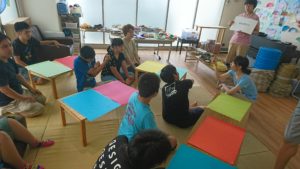みんなが集まったところで先生からのお話です。机にはそれぞれの作品の展示スペースを兼ねた、色鮮やかな画用紙が用意され、いつもと違う雰囲気にワクワクです♪