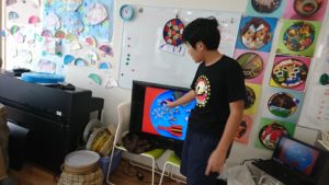 そしてみんなの作品ができたら、撮った写真を画面で映しながらお披露目会です。先生からの講評(好評)に、自分の作品が映し出されると恥ずかしそうにしながらも嬉しそうな表情を浮かべる子どもたち(#^^#)