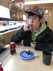 さて、ボルダリングで一汗流したあとはお楽しみの昼食ですが、Tくんの大好きなものと言えばなんといってもお寿司です。