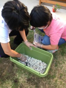 まずは専用のプランターに水はけを良くする為に鉢底石を敷き詰めならしていきます。