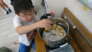 こちらは蒸し器を使ってじゃがバターづくり。職員的にはもうちょっと手順ある調理がいいかななんて思っちゃったりもしますが(笑)、おいも料理でリクエストを取ったら人気があったので。やっぱり食べたいものを作るって大事!こちらもホクホクでおいしかった(^_-)-☆