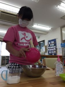 お豆腐と白玉粉を混ぜます。感触やひんやりとした冷たさなどを感じながらの作業です。