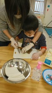 まずは下校の早い小学生メンバーで材料を具材を切って下ごしらえ。