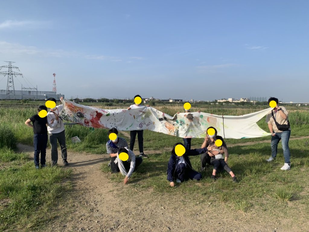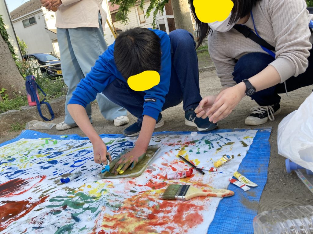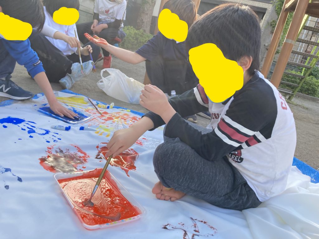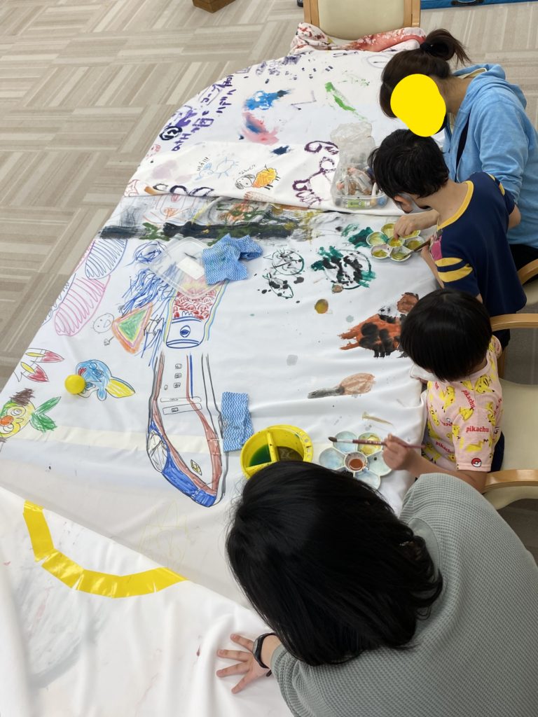 絵の具やクレヨンを使って、大きくて真っ白な布の上に個性が爆発!