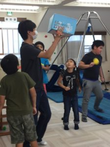 スタッフが持つかごをめがけて制限時間内に決められた数の玉を入れることができたらみんなの勝ちです!よーいドンの音楽と共にみんなかごをめがけて上手にスローイング。自分の身長より高い、動く的をみんなで追いかけ、チームプレイでとてもたくさんの玉を入れることができました(#^^#)