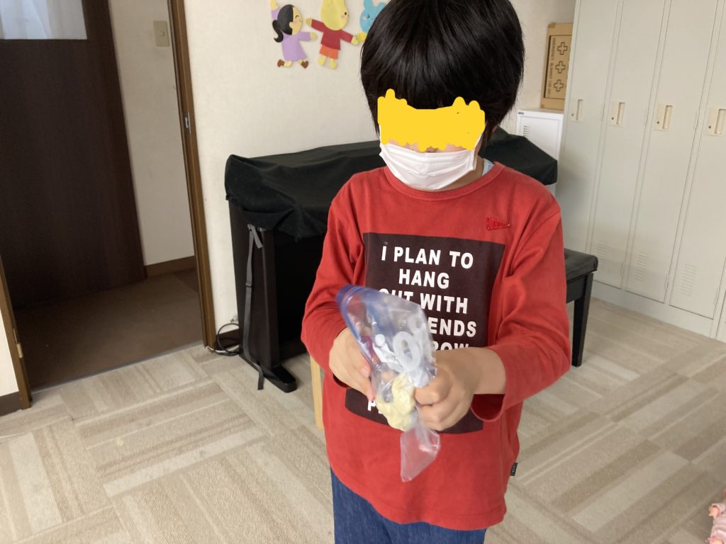 (袋に入れて頑張ってこねています。感触が気持ちいいね!)