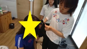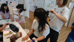 まずはヘアアレンジコーナーです。ヘアアイロンやコテでいつもと違う髪型にチャレンジしてみます。シュシュや髪ゴムなど、様々な選択肢からどうしようか悩みます。