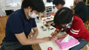 普段からネイルが好きなMちゃん。ふくふくでは得意分野では子どもたちでも先生です。ブースの中に入って、他の子どもやスタッフにネイルをしてもらいました♪