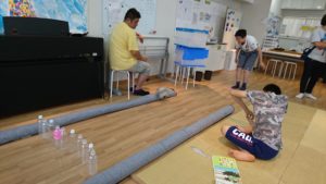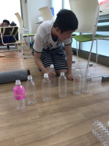 こちらはペットボトルを使ったボーリング大会。普通のボーリングと違うのは、ピンを好きな配置で並べられるので、チームメイトが倒しやすいようにどう並べるか、そこも戦略とチームプレイの見せどころです♪