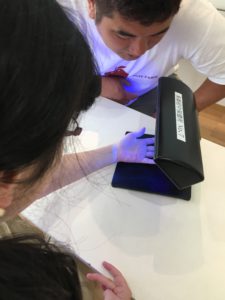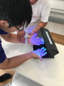 手洗いチェッカーに手をかざすと洗えていないところが青く光って一目でわかります。