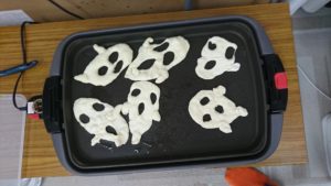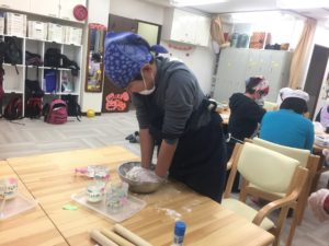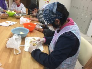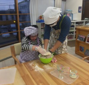 続いてこちらはカレーにつけて食べるナンづくりのメンバー。材料を混ぜ合わせる所からスタートしました。「冷たい~」「粉がなくなってきた!」などとその触感などを楽しみながら作業スタート。こねて、めんぼうで伸ばしてと、力をこめて頑張ります。そして今回作るのはただのナンではありません。まるでお化けのハロウィンナンです。ペットボトルのふたで目や口を繰り抜き、手を付けて焼けば、雰囲気満載の素敵なハロウィンナンの完成です(^^)