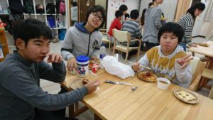 つくったカレーとナンに加え、ピザ、から揚げ、サラダ、ジュース、お菓子盛り合わせ、そしてデザートと豪華なメニューを部屋に並べ、バイキング形式のまさにパーティーです!