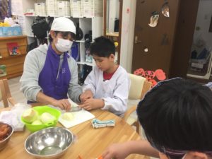 まずは、色んな場面でおなじみだけどみんな大好き、定番メニューであるカレー班のメンバーです。野菜は皮むきから、お肉を切ったり、炒めたりとみんな本当に手慣れた様子でカレー作りに励みます。包丁もお手の物!
