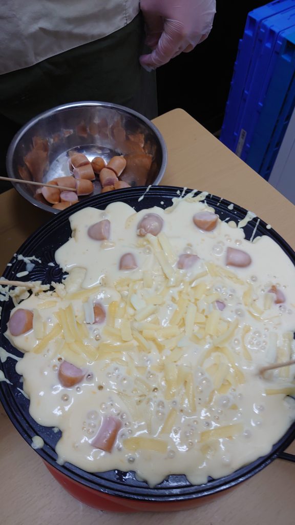その日は午後からの出発だった為、午前中はおやつ調理でホットドッグを作りました。ホットケーキの粉と水と卵を混ぜて、たこ焼き器の中に流しいれて、具材を入れて、ひっくり返せば、出来上がりです。こぼさないように混ぜたり、流し入れたりしていました。具材もツナ・チーズ・ウインナーの3種類で、そっと、入れる様子がありました。