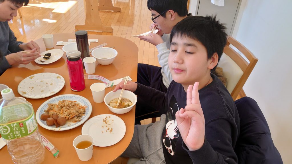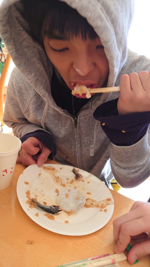 お餅つきをした後は2階の飲食スペースでお餅や焼き魚やつみれ汁などをいただきました。どの子どもも勢いよく、「おいしい!」と「もっと、食べたい!」と言って、もりもりと食べてました。スタッフも一緒に食べたのですが、どの食事も、美味しく楽しめました!