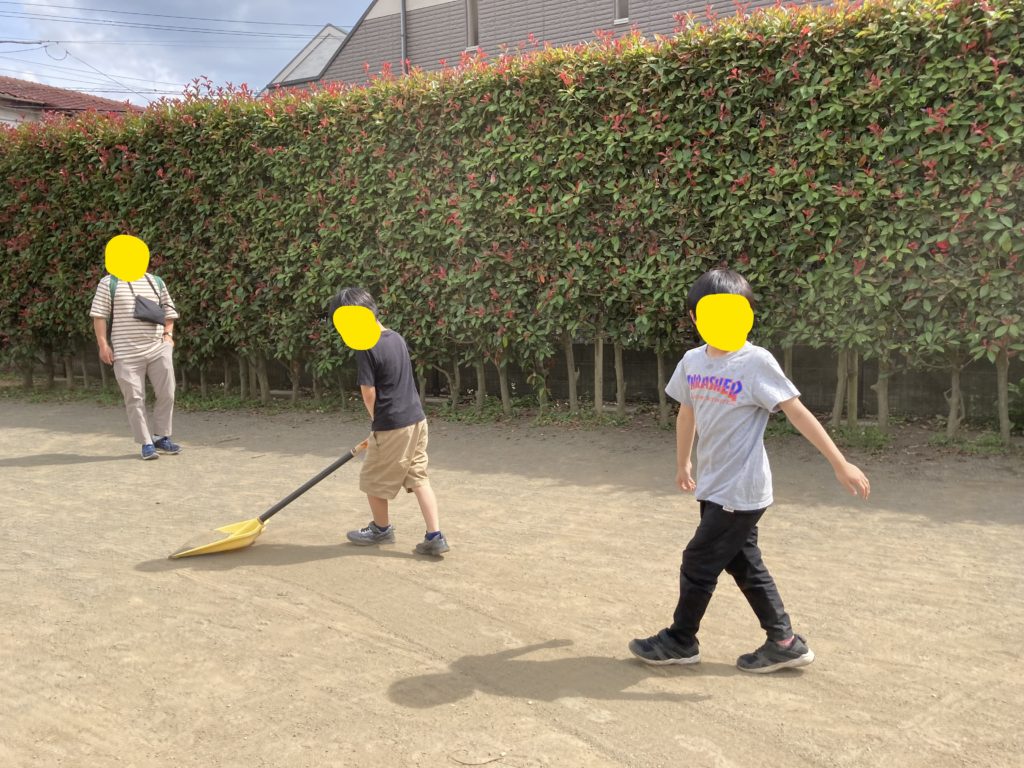 ブルドーザーになりきってスコップで道を作る子。その道を歩く子。