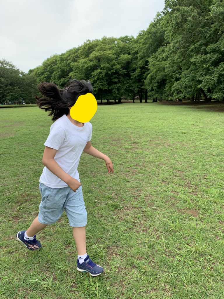 広い芝生の上を思いっ切り走る子。