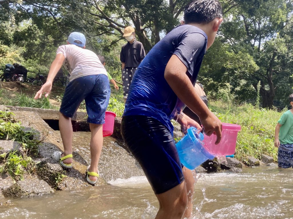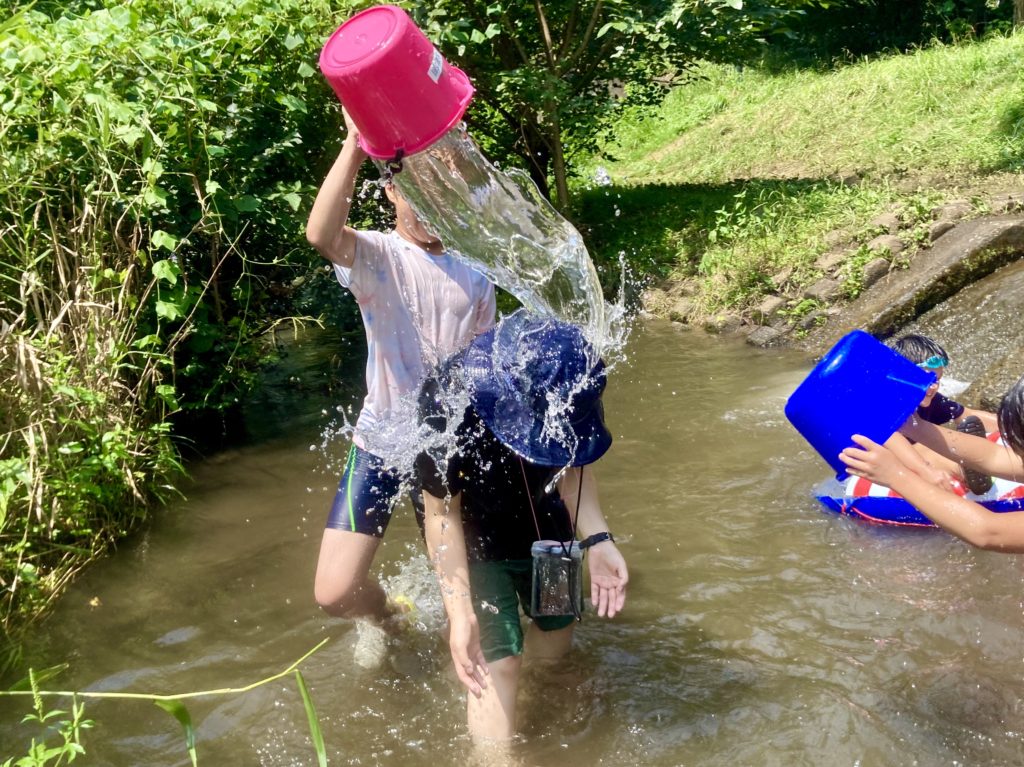 野川での水遊びは、”バケツ”を使ってダイナミックに!