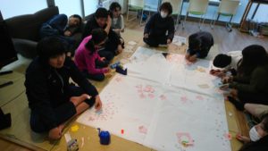 まずは模造紙を貼り付け、土台づくり。みんなでつくる大きな制作物は久しぶりです。