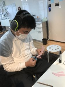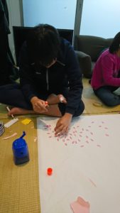そして花を咲かせていきます。こちらも桜色の貼り絵をしたり、また、花びらの形に画用紙を切っていきます。