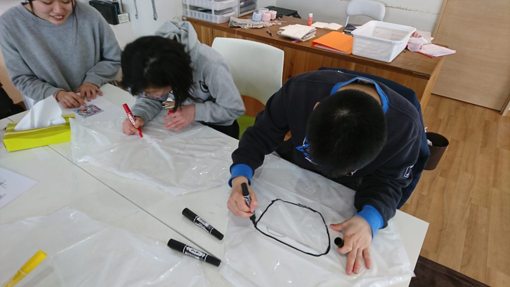 まずは凧の形に切ったビニールにストローの骨組みや糸をつけたり、各々好きな