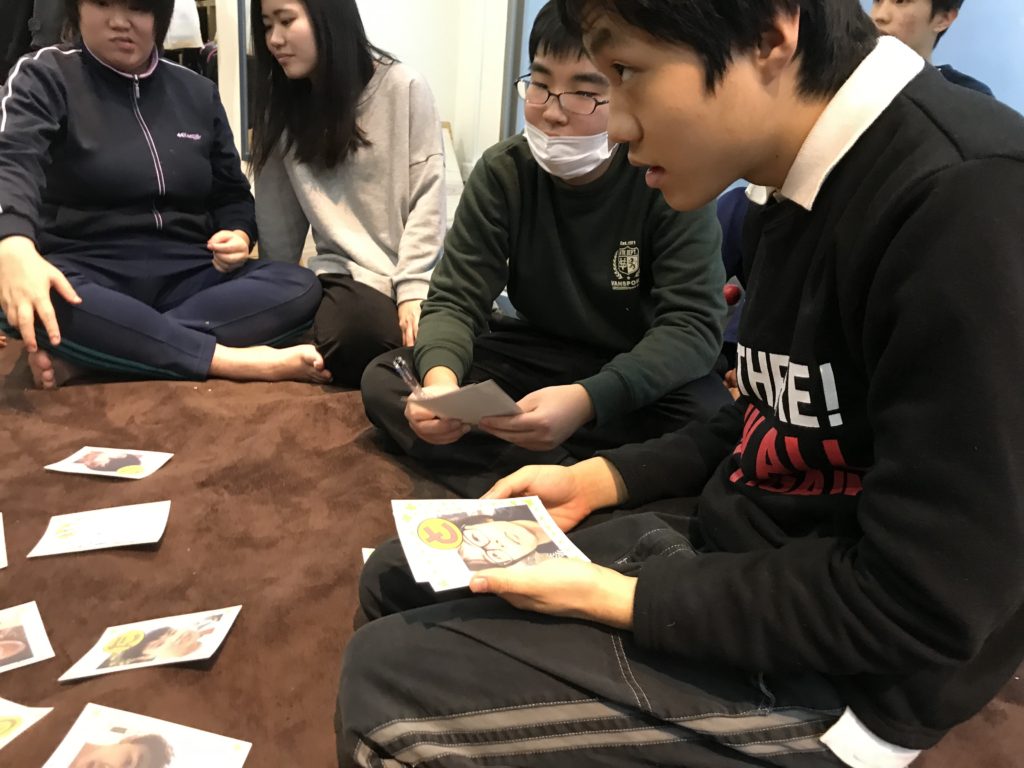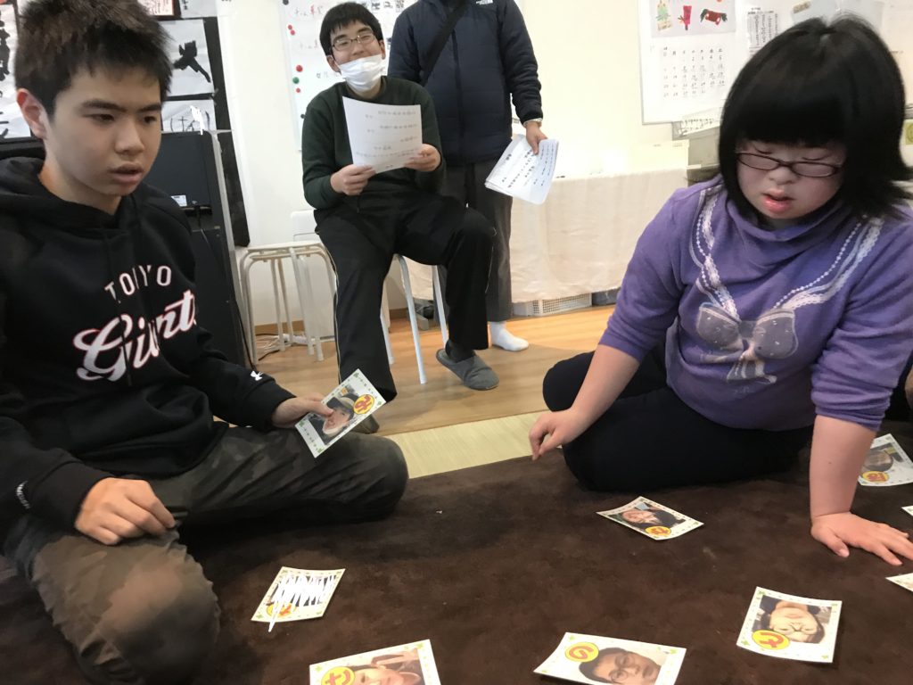 読み手と札をとる側に分かれて、1人1人の顔写真をカルタにした「友達カルタ」