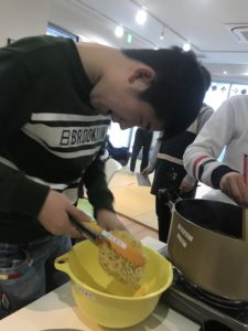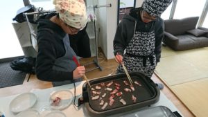 まずはホットプレートでおかずを焼いたり、スパゲッティを茹でたりと班に分かれて調理。