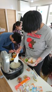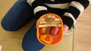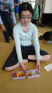 しっかり区分けしてよそう子、好きな物を最初にどーんと取って後からスペース調整に困る子、お弁当箱では足りないからおにぎりやサンドイッチをラップに包んで準備する子、キャラが出てとても面白いです。けどみんなとても上手なお弁当ができたねぇ。