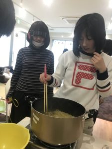 「もし電気ポットが使えないときはどうする?」など話しをしながら、カセットコンロで鍋にお湯を沸騰させ、麺を投入していきます。