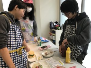 一周したら、店員さんとお客さんの役割チェンジをし、みんな自分好みのハンバーガ―を作成。