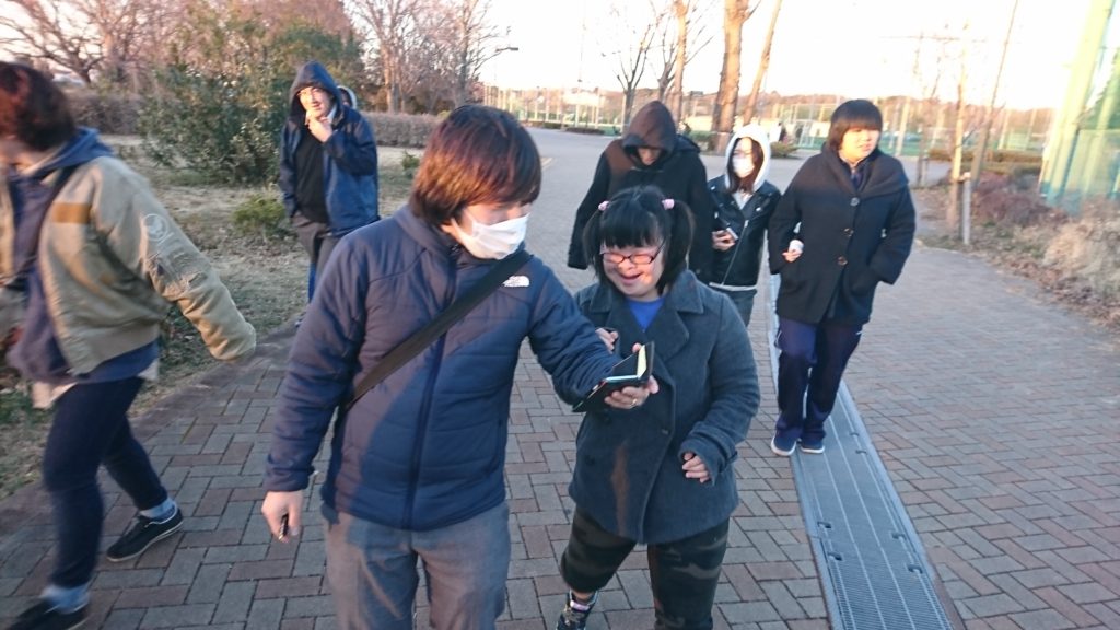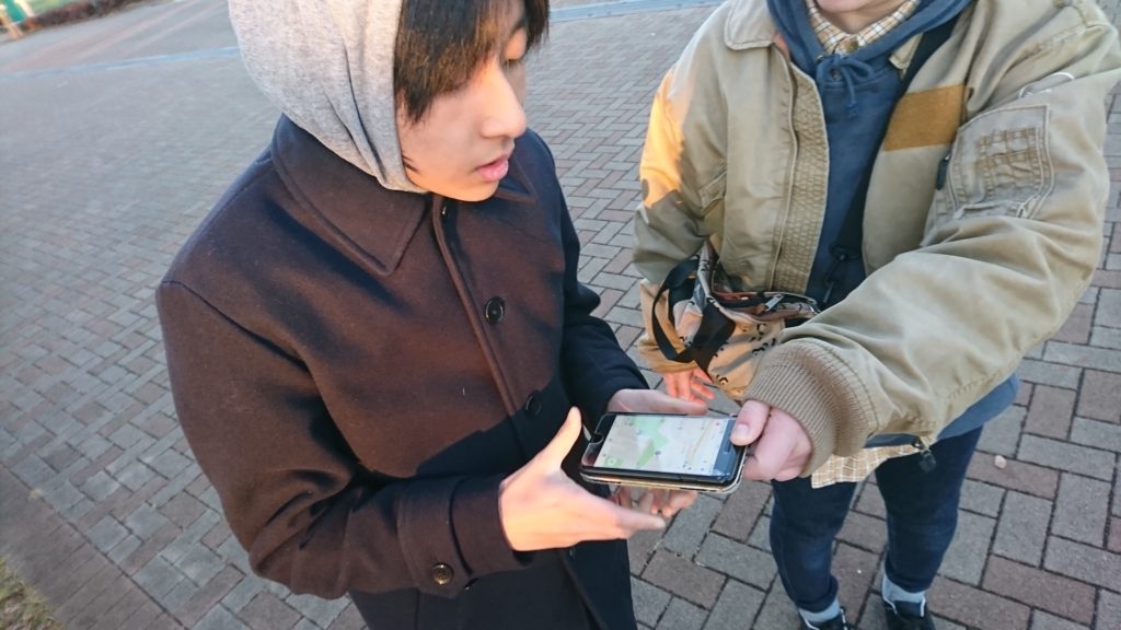 追いかけるハンターは3チームに分かれて、それぞれのスタッフのスマホの地図を見て、「あっちじゃない」「うちらはあっちから回り込もう」などと作戦をたててから歩き始めます。