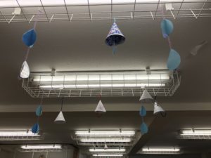 にこにこキッズルームも梅雨入りし、蛍光灯から雨がしとしとと降り続いています。