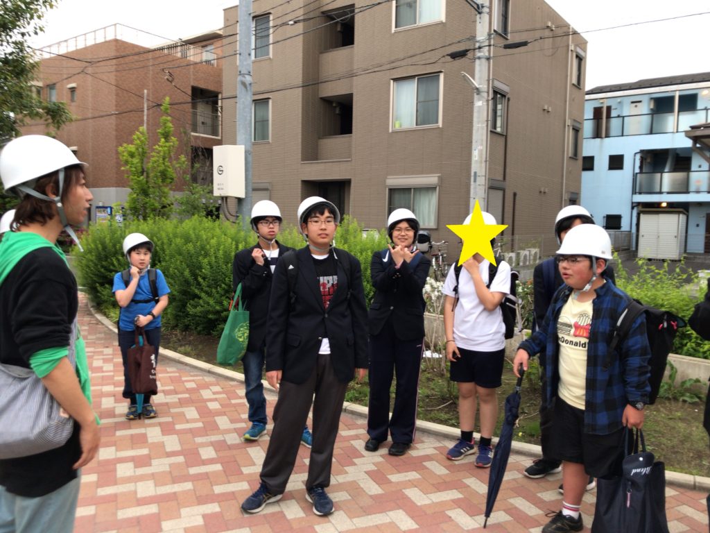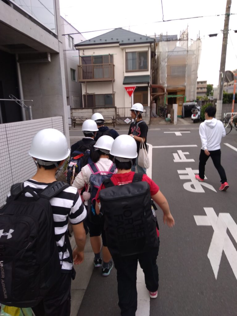 さて、いつもの避難訓練であればここで終わりですが、今回は引き取り訓練。そのまま緊急避難場所の学校まで歩いて移動していきます。移動中も、「マンションのベランダから物が落ちてきたら危ないね」などお話をしながら学校へ。