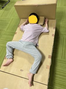 段ボールのベッドのごろんっ。寝心地抜群です…