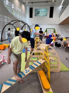 屋内には期間限定でインクルーシブ遊具があり、床もやわらかく安心して身体を動かせるスペースも
