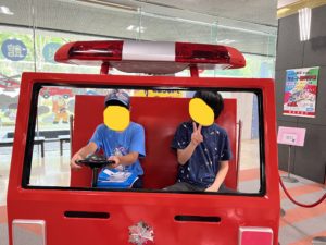 消防車の火消しゲームや防災グッズなども展示されていて、子どもたちは興味深々です。