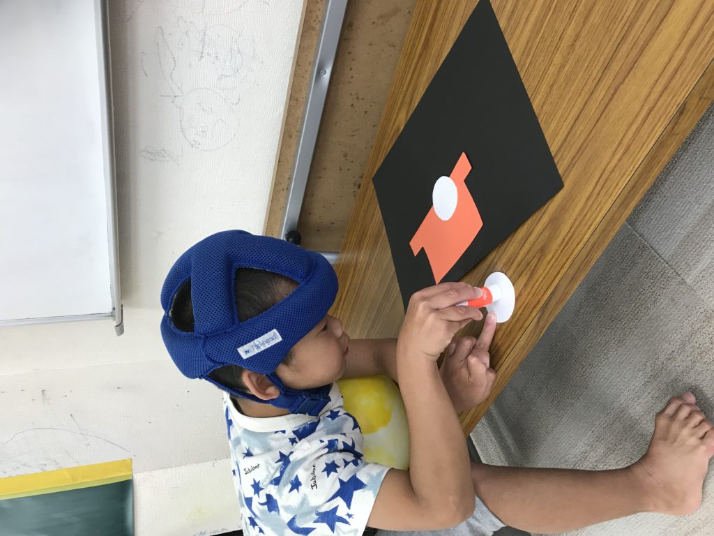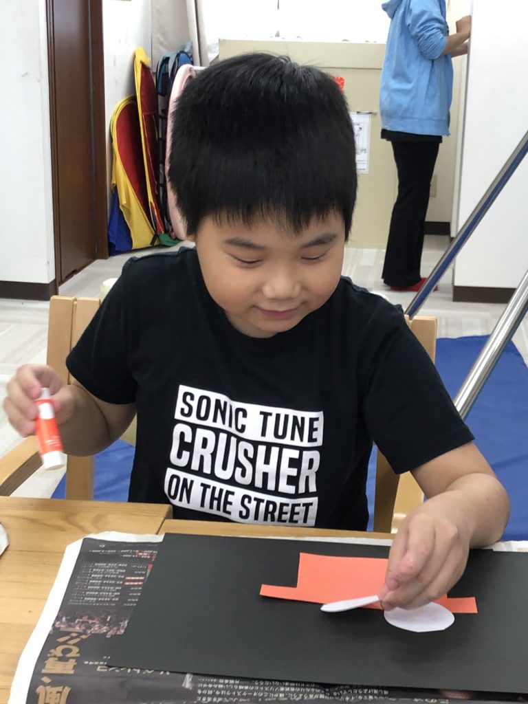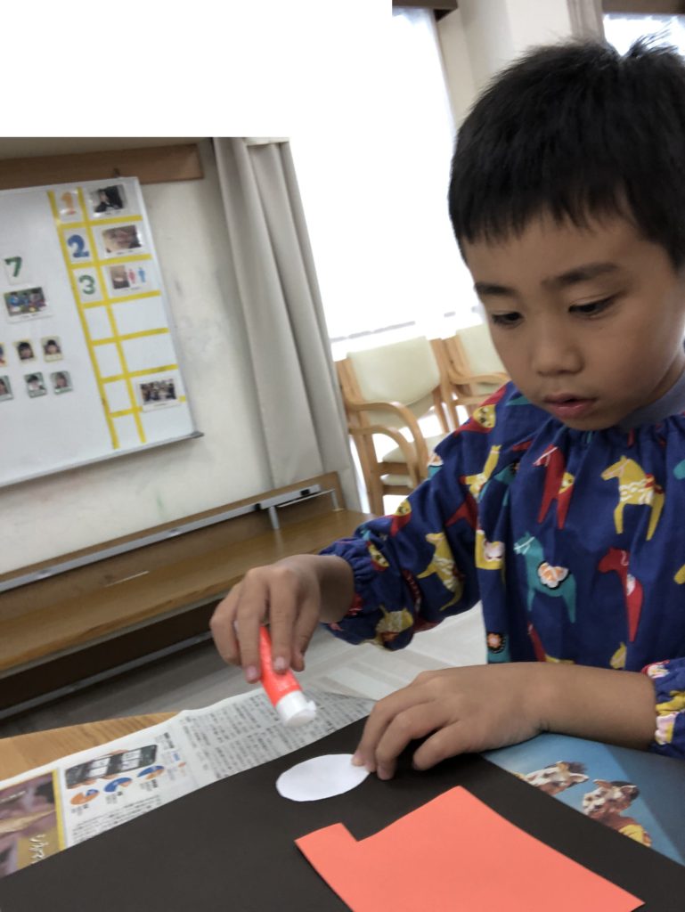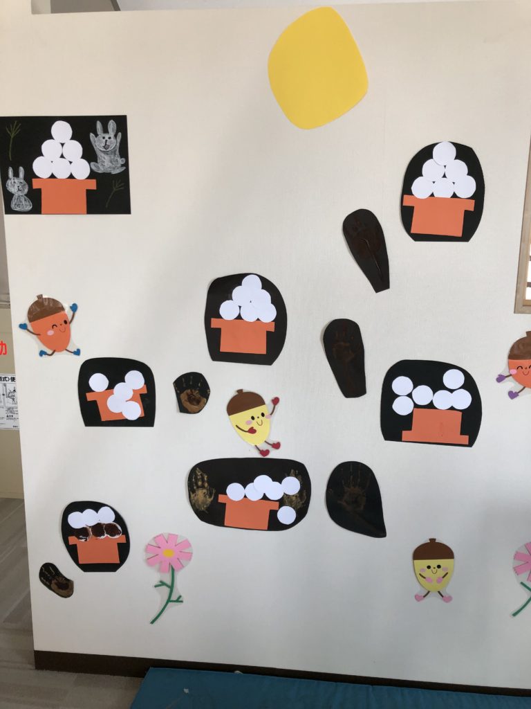 Tくん、Sくん、Kくんがつくっているのは お月見だんごと 絵の具を使って手形で 稲穂つくりました。
