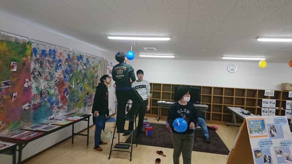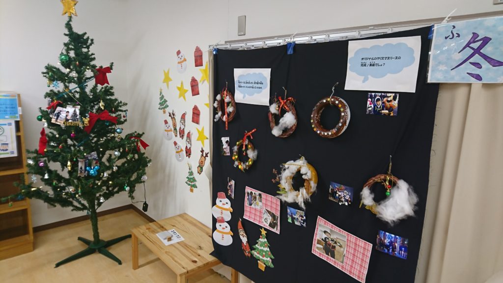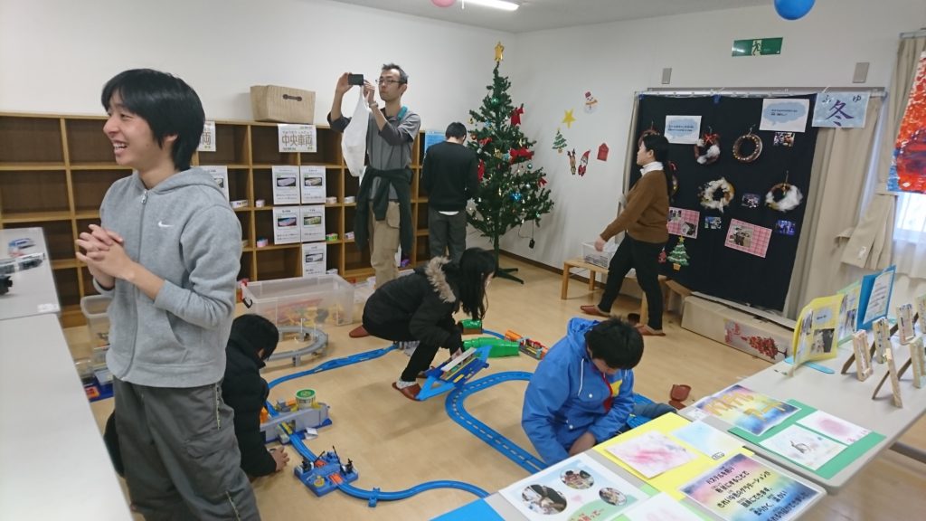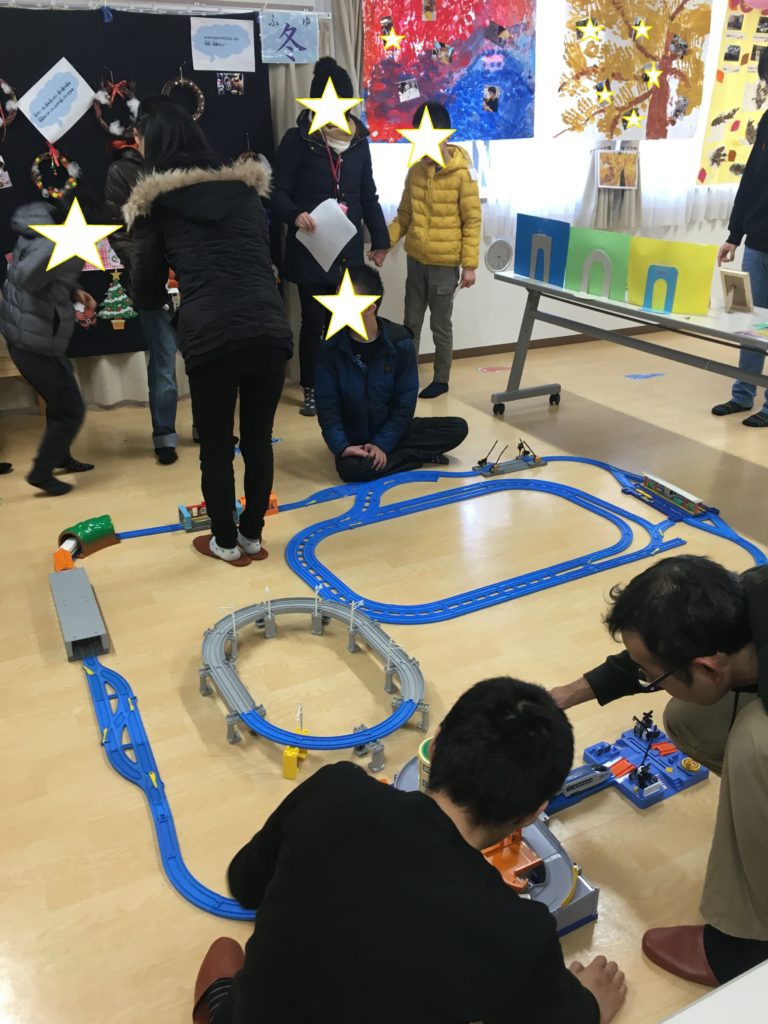 作品展は一日活動の日でもあったので、開始の13:00までは子ども達も一緒に準備を行いました。プラレールを組み立てたり、クリスマスツリーを出したり、体験コーナーの太鼓練習をしたりとやることは盛りだくさんでした。「ここをこうしよう」や「ここは聞かなきゃ!」と自分で考えたり、友達やスタッフと話し合う様子もありました。しかし、子ども達の頑張りで作品展の会場も完成しました。