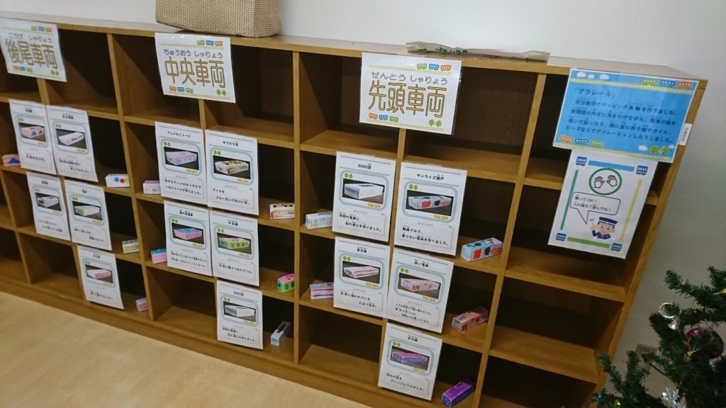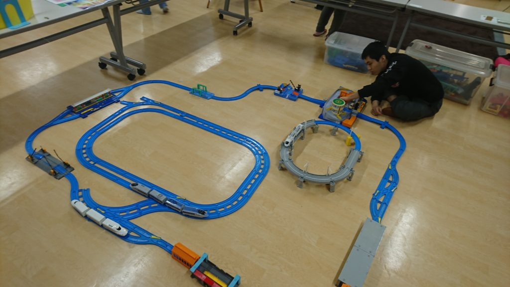 その先はプラレールが展示してあります。ここでは体験コーナーとして自由にプラレールの上部分を変える事が出来て、走らせる事が出来ます。
