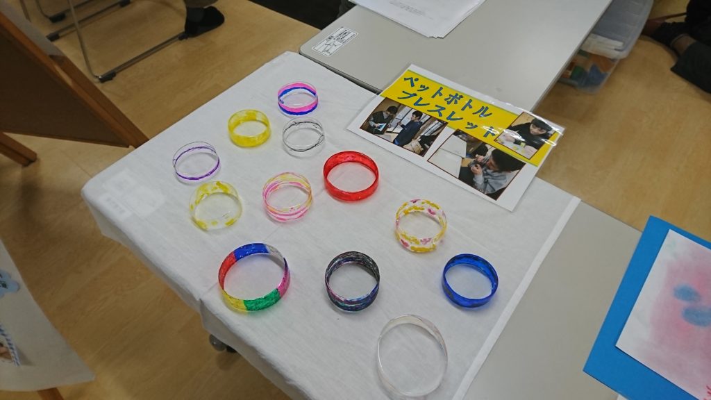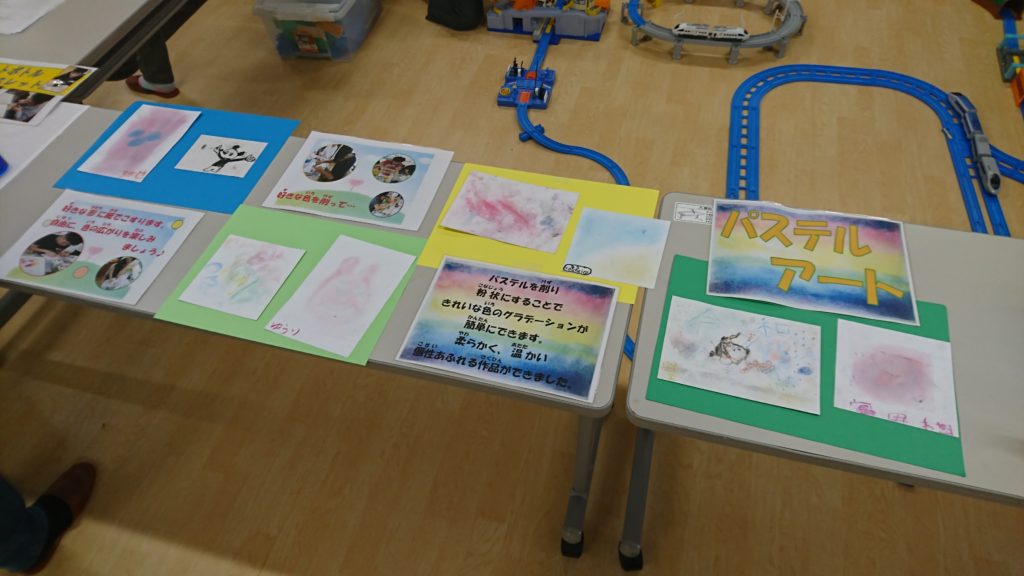 プラレールコーナーを通り過ぎるとプラバンとアイロンビーズ、パステルアート、ペットボトルブレスレットと盛りだくさんの内容になってます。