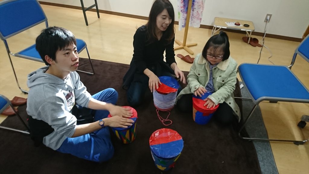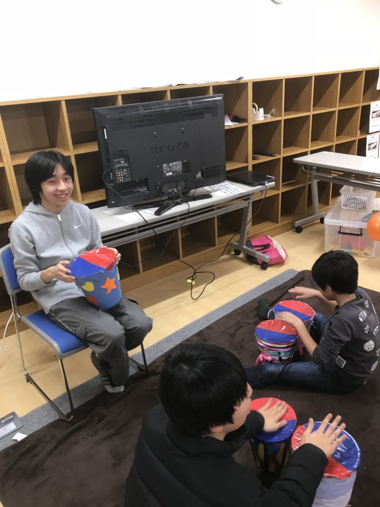 その先は音楽に合わせての太鼓演奏が出来る体験コーナーがあります。今回、叩いた曲は“パプリカ”と“USA”でした。来てくれた子どもとふくふくの子どもがリズムに合わせて、一緒に太鼓演奏をしました。