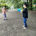 そう、ふくふくの水遊びは子供もスタッフも武器(水鉄砲)を一人一丁持ってかけ合うのです!
