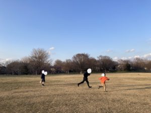 芝生が広がる武蔵野の森へ出かけて、みんなで追いかけっこをして遊んだり、