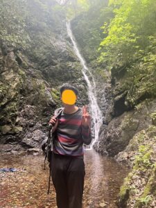 滝を流れる水に手を入れると、Rくんは水の冷たさが気持ちよい様子。