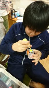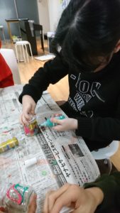 瓶をガラス絵の具で彩っていきます。側面への塗装は、塗った傍からタラタラと垂れてきてとっても難易度高めでしたが、集中して頑張っています!