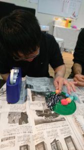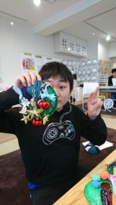 そして2つ目にリース作り。毛糸や、絵の具を混ぜた紙粘土で飾りつけていきます。