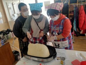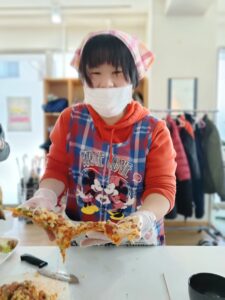 チキン、パスタ、ピザ、ケーキを班に分かれて作りました。